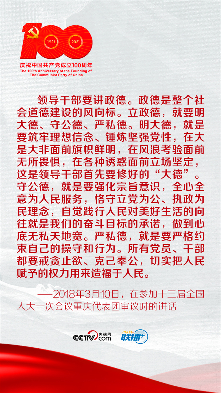 國無德不興,人無德不立。政德絕非私事、小事,而是事關黨的形象和創(chuàng)造力、凝聚力、戰(zhàn)斗力的大事、要事。央視網《聯(lián)播+》特梳理總書記重要講話,與您一起學習。