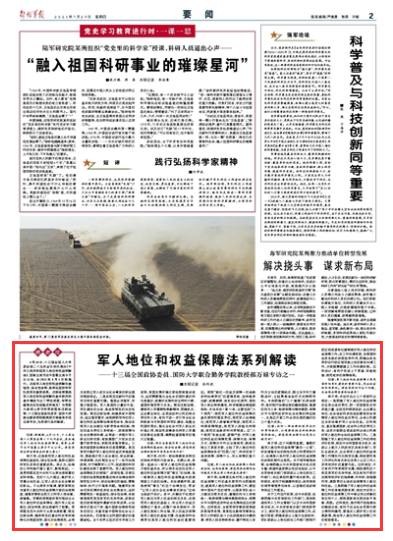 6月10日,十三屆全國人大常委會第二十九次會議表決通過《中華人民共和國軍人地位和權益保障法》,國家主席習近平簽署主席令予以公布,自2021年8月1日起施行。這是軍人地位和權益保障的基礎性、綜合性法律,是深化國防和軍隊改革的重要成果。這部法律圍繞軍人地位和權益保障的基本原則和基本制度作出了哪些規(guī)范,有哪些值得關注的創(chuàng)新點和亮點?為幫助大家深入學習和貫徹落實這部法律,十三屆全國政協(xié)委員、國防大學聯(lián)合勤務學院教授郝萬祿接受本報記者專訪,為您進行系列解讀。