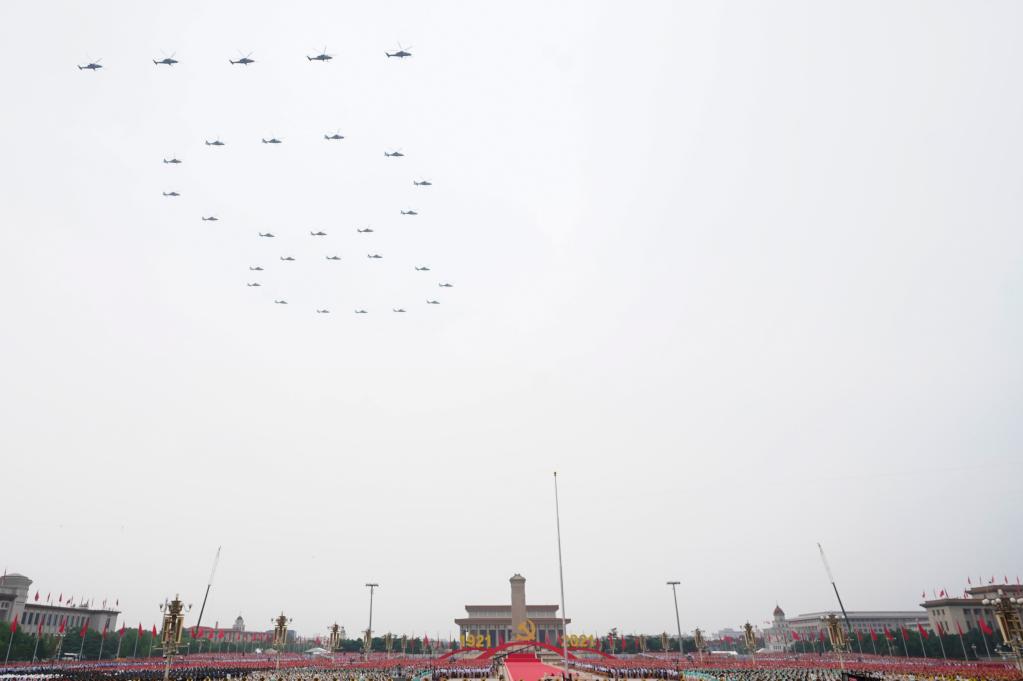2021年7月1日上午,慶祝中國共產(chǎn)黨成立100周年大會在北京天安門廣場隆重舉行。這是大會開始前的飛行慶祝表演(2021年7月1日攝)。新華社記者 高潔 攝