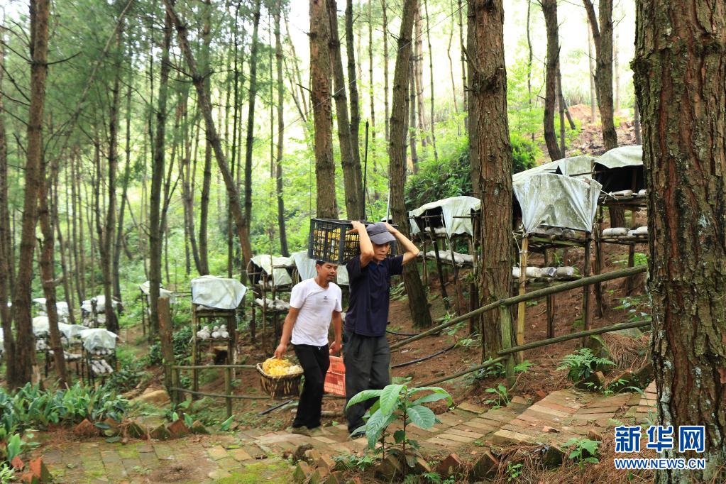 當(dāng)?shù)厝罕娫谫F州省六盤水市六枝特區(qū)月亮河鄉(xiāng)的花德河國有林場(chǎng)內(nèi)收獲菌類(2021年7月24日攝)。 新華社發(fā)(令狐榮駿 攝)