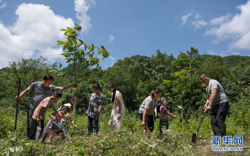姚祖元(右一)與家人一起種樹(2019年7月13日攝)。在秦嶺深處的陜西省漢中市留壩縣火燒店鎮(zhèn),姚家5代人歷時(shí)70年深耕秦嶺的故事在當(dāng)?shù)丶矣鲬魰裕瑐鳛榧言挕?新華社記者 陶明 攝