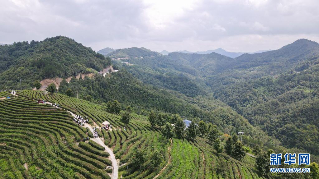 游客在位于陜西省安康市平利縣老縣鎮(zhèn)蔣家坪村的女媧鳳凰茶業(yè)現(xiàn)代示范園區(qū)參觀游玩(2021年7月24日攝,無人機(jī)照片)。 新華社記者 徐欽 攝