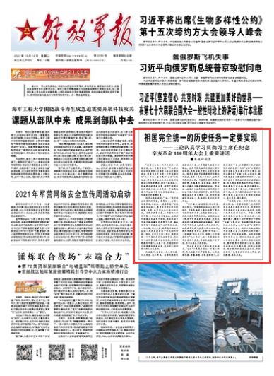 “祖國完全統(tǒng)一的歷史任務(wù)一定要實現(xiàn),也一定能夠?qū)崿F(xiàn)!”習(xí)主席在紀(jì)念辛亥革命110周年大會上的重要講話,鄭重宣示了堅持一個中國原則和“九二共識”、堅決遏制“臺獨”分裂活動、捍衛(wèi)國家主權(quán)和領(lǐng)土完整的堅強決心與堅定意志,揭示了祖國統(tǒng)一、民族復(fù)興的歷史大勢,指明了兩岸關(guān)系的前進(jìn)方向,必將更進(jìn)一步凝聚起海內(nèi)外全體中華兒女實現(xiàn)祖國統(tǒng)一、民族復(fù)興的磅礴力量。