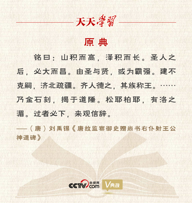 《唐故監(jiān)察御史贈(zèng)尚書(shū)右仆射王公神道碑》為唐代詩(shī)人劉禹錫所撰,碑主為王俊,碑文中有韻的部分為銘文。“山積而高,澤積而長(zhǎng)”出自該碑銘文起首,采用了比興手法。意思是,山是由土石日積月累才高聳起來(lái)的,水是由點(diǎn)滴積聚才長(zhǎng)流不斷的。兩個(gè)“積”字,突出了量變的作用。不斷積累,山可高,水可長(zhǎng),點(diǎn)滴努力,鑄就成功。
