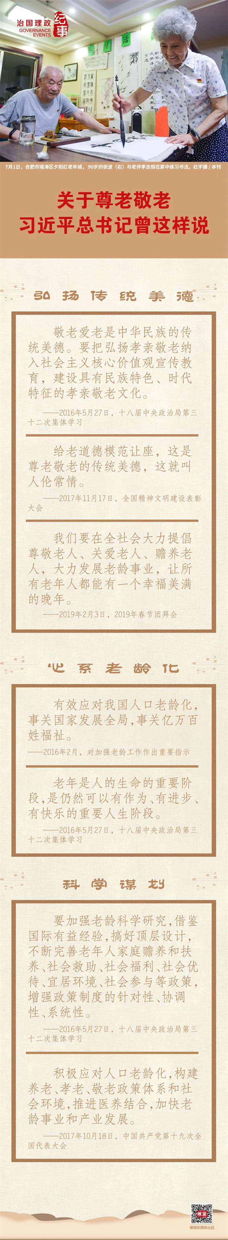 ◆ 大孝忠于國。從孝順父母,到關愛老干部,到對貧困老人噓寒問暖,習近平總書記推己及人,敬老尊賢,努力讓天下老年人安度晚年