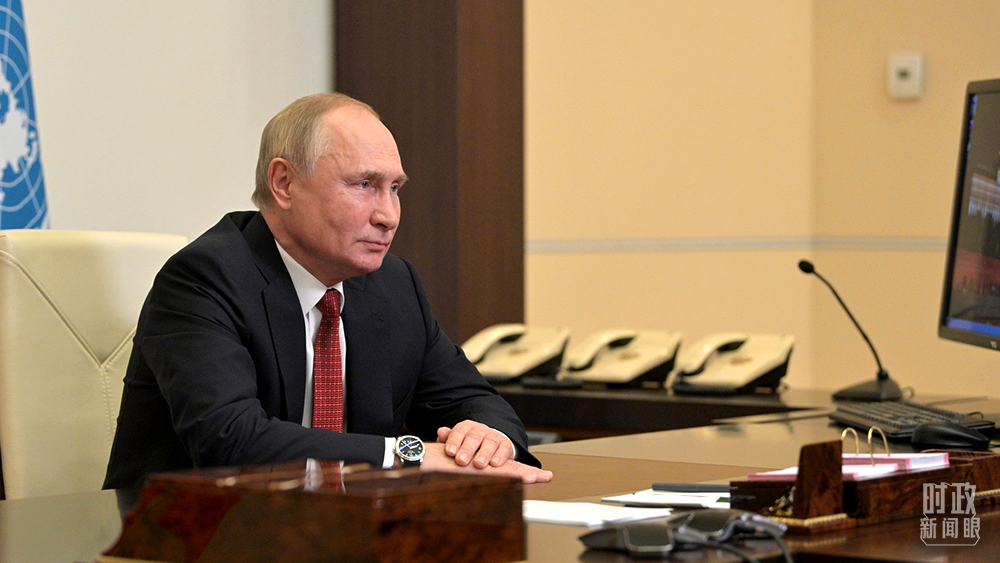 △俄羅斯總統(tǒng)普京、法國總統(tǒng)馬克龍通過視頻方式致辭。