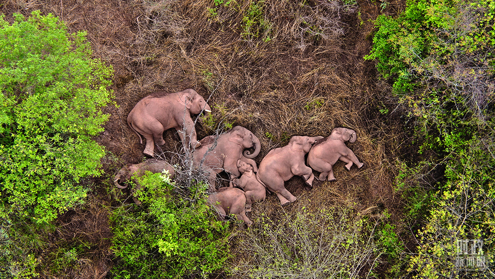 △2021年6月7日,云南省森林消防總隊的無人機(jī)監(jiān)測人員觀測到野象群暫停遷徙的一幕。這是監(jiān)測野象12天來,第一次發(fā)現(xiàn)象群集體躺著睡覺。(圖/視覺中國)