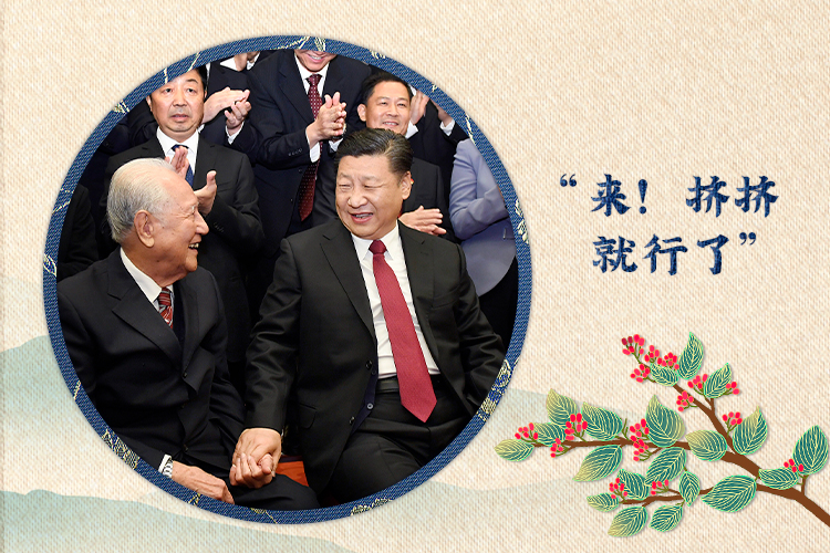 總書記拉著他們的手,請兩位老人坐到自己身邊來,兩人執(zhí)意推辭,總書記一再邀請:“來!擠擠就行了,就這樣。”自然而然的舉動,正是總書記尊老敬賢的真情流露。