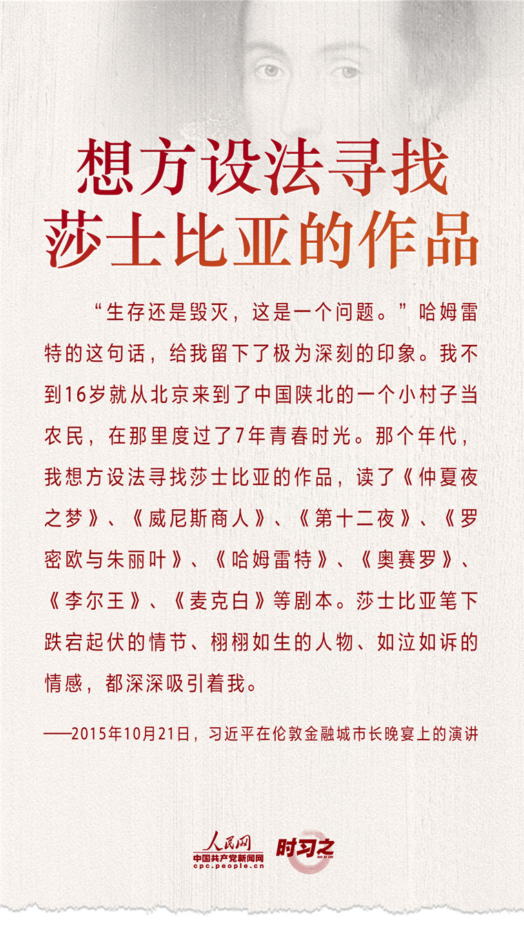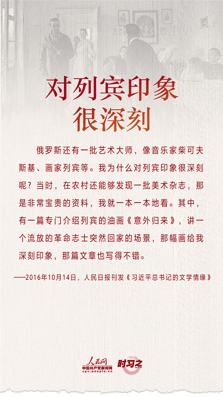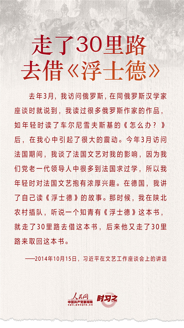 2014年10月15日,習(xí)近平總書記主持召開文藝工作座談會并發(fā)表重要講話。在講話中,習(xí)近平多次回憶起自己青年時期的閱讀史,談及多部國內(nèi)外經(jīng)典文學(xué)藝術(shù)作品。習(xí)近平在很多場合都曾表達(dá)自己對于文學(xué)藝術(shù)的喜愛,分享感悟。人民網(wǎng)·中國共產(chǎn)黨新聞網(wǎng)梳理了部分習(xí)近平講述過的他熟讀文學(xué)經(jīng)典、欣賞文藝作品的故事,以饗讀者。