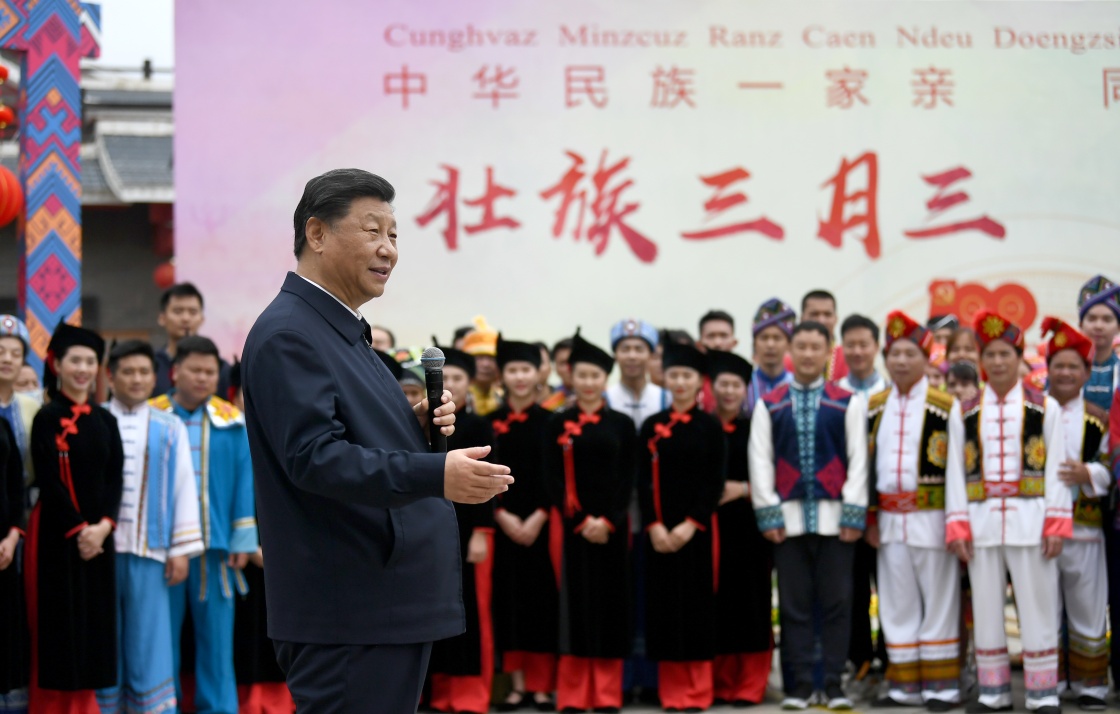 2021年4月25日至27日,中共中央總書記、國(guó)家主席、中央軍委主席習(xí)近平在廣西考察。這是27日上午,習(xí)近平在南寧市廣西民族博物館外,同參加三月三“歌圩節(jié)”民族文化活動(dòng)的各族群眾親切交流。 新華社記者 謝環(huán)馳/攝