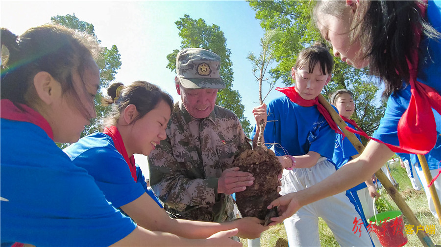 張連印為小學(xué)生講解植樹(shù)方法。丁美寧 攝