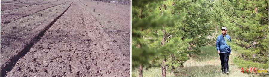左圖:2004年,張家場(chǎng)村的荒地;右圖:2021年,張連印在繁育的樹(shù)林中行走。(拼版照片)(陸海亮提供)