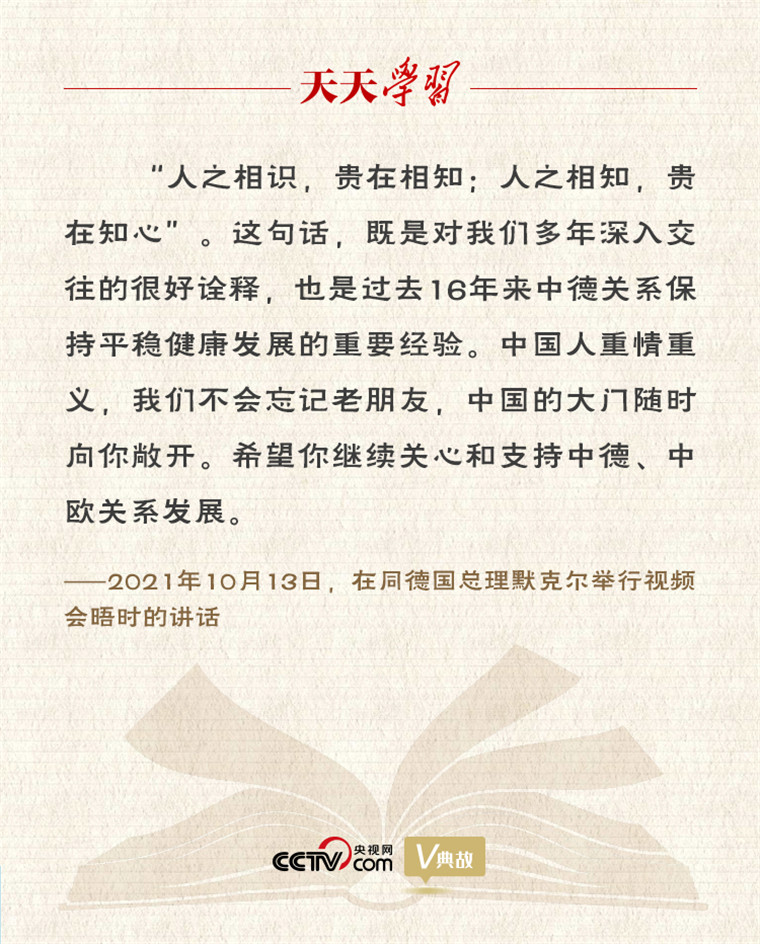 10月13日,習(xí)近平主席同德國總理默克爾舉行視頻會晤。雙方在友好的氛圍中回顧近年中德、中歐關(guān)系發(fā)展并就相關(guān)問題深入交換意見。習(xí)主席積極評價默克爾任內(nèi)為推動中德、中歐關(guān)系發(fā)展所作的貢獻,并引用“人之相識,貴在相知;人之相知,貴在知心”,稱這句話“既是對我們多年深入交往的很好詮釋,也是過去16年來中德關(guān)系保持平穩(wěn)健康發(fā)展的重要經(jīng)驗”。