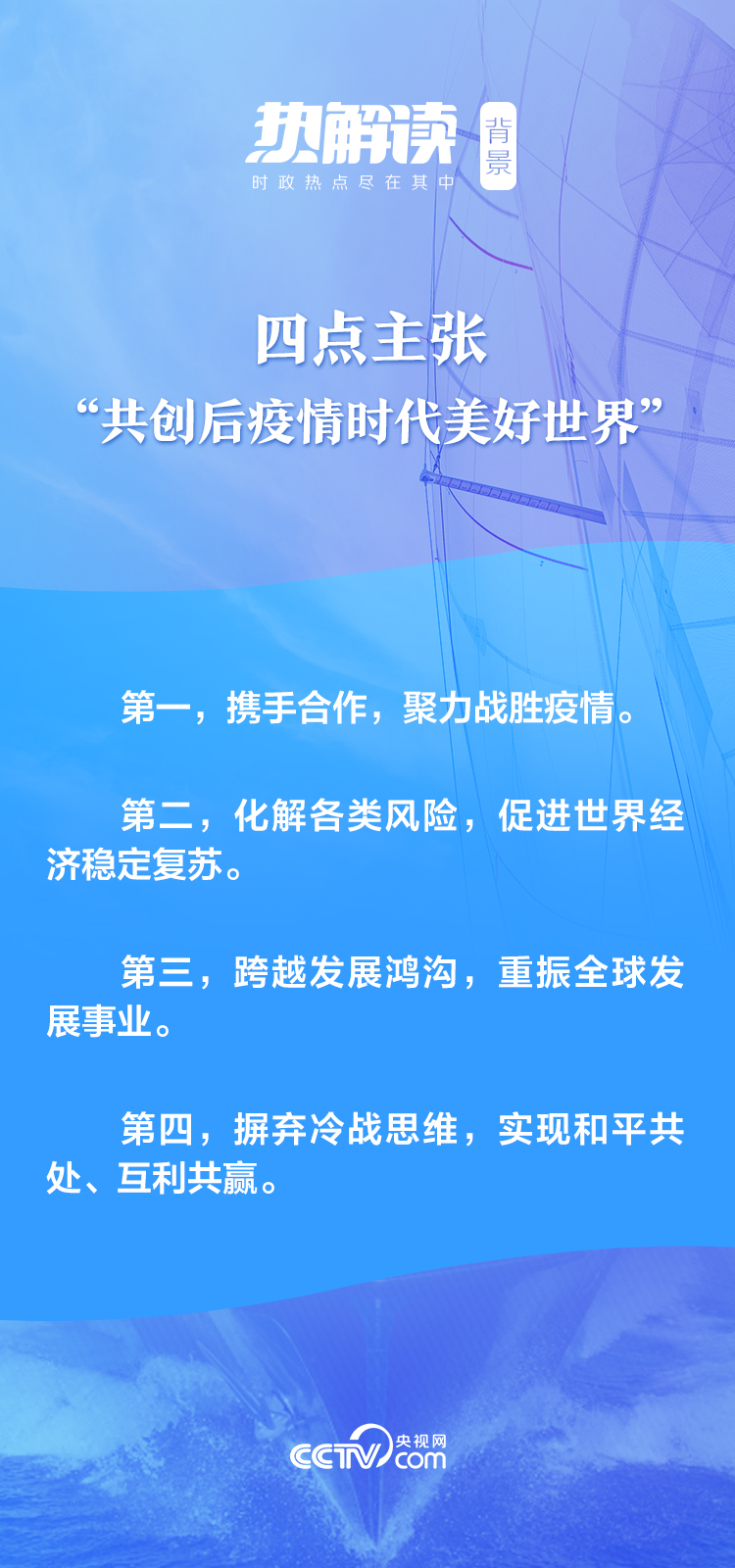 著眼人類前途命運,前瞻世界發(fā)展大勢,直面問題挑戰(zhàn)、把脈時代課題、提出中國方案,習(xí)近平主席以宏闊的國際視野和高度的責(zé)任擔(dān)當(dāng),提出“四點主張”“三項承諾”,為共創(chuàng)后疫情時代美好世界指明了方向。
