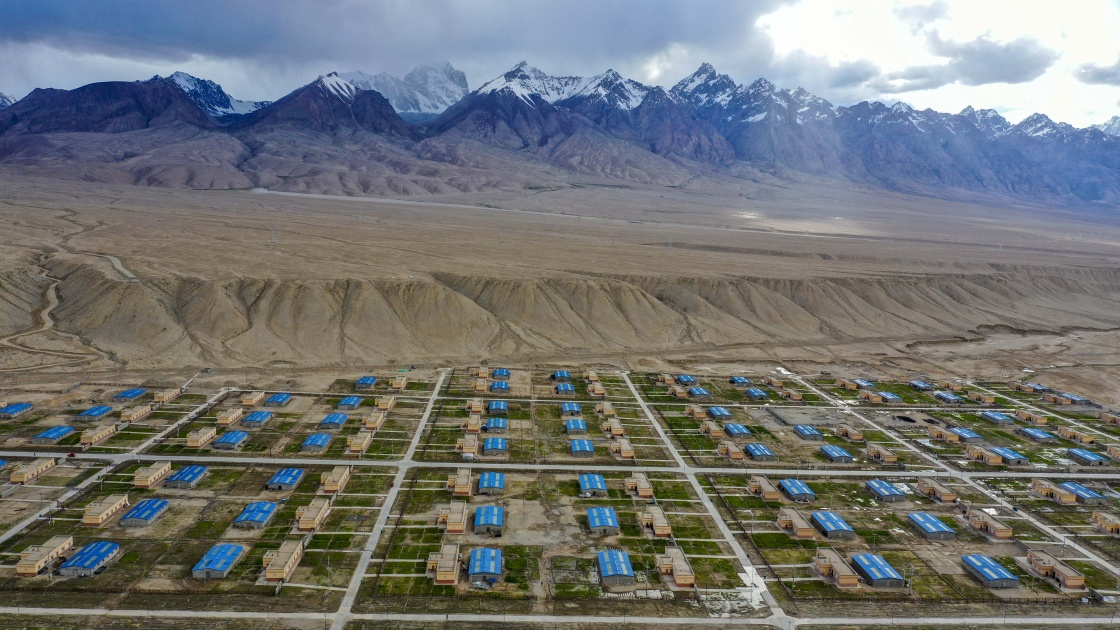 這是在新疆塔什庫(kù)爾干塔吉克自治縣縣城附近拍攝的塔提庫(kù)力易地扶貧搬遷安置點(diǎn)(2019年7月1日攝,無人機(jī)照片)。新華社記者 胡虎虎 攝
