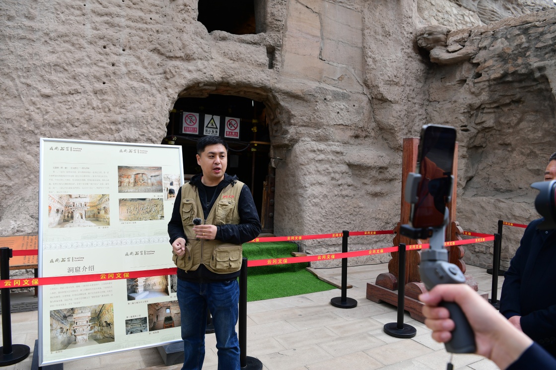 5月11日,云岡研究院工作人員孫波在云岡石窟第1窟進行文物保護專題直播。新華社記者 楊晨光 攝