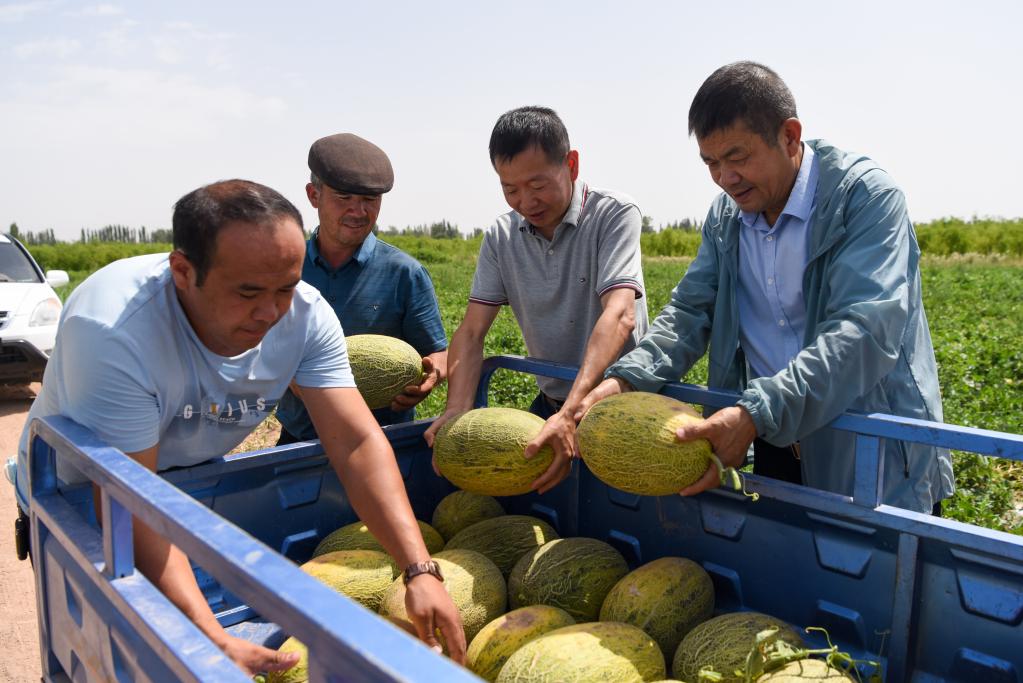 在新疆喀什地區(qū)伽師縣臥里托格拉克鎮(zhèn),廣東援疆佛山駐伽師工作隊(duì)的干部幫助農(nóng)戶(hù)采收伽師瓜(2021年7月11日攝)。新華社記者 丁磊 攝