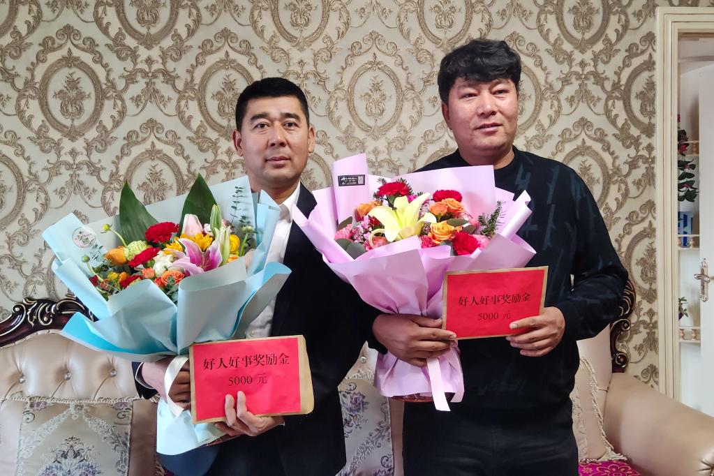 新疆庫(kù)爾勒市貨運(yùn)司機(jī)曼蘇爾·帕塔爾(右)和買(mǎi)買(mǎi)提·努爾東收到來(lái)自江蘇省徐州市的特殊感謝信(2022年1月6日攝,手機(jī)照片)。新華社發(fā)(黃萬(wàn)里 攝)