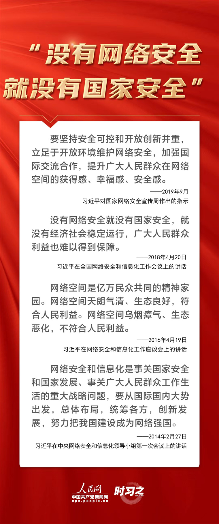 沒有網(wǎng)絡(luò)安全就沒有國家安全。今年是《中華人民共和國網(wǎng)絡(luò)安全法》施行五周年。一直以來,習(xí)近平總書記高度重視網(wǎng)絡(luò)安全和信息化工作,敏銳把握信息時(shí)代“時(shí)”與“勢(shì)”,多次在不同場(chǎng)合就網(wǎng)絡(luò)安全發(fā)表一系列重要論述,為維護(hù)國家網(wǎng)絡(luò)安全,筑牢國家網(wǎng)絡(luò)安全屏障奠定基石。