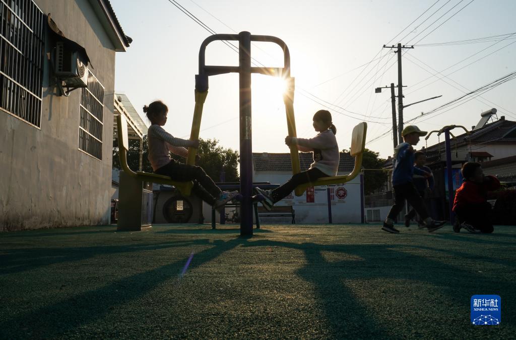 小朋友在鎮(zhèn)江市世業(yè)鎮(zhèn)永茂圩自然村的文化活動廣場玩耍(2020年4月13日攝)。新華社記者 季春鵬 攝
