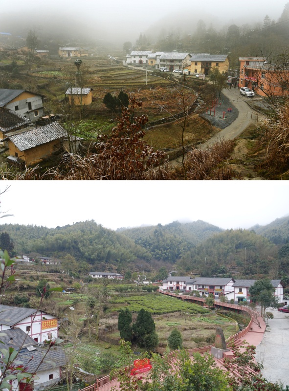 拼版照片:上圖為2016年2月2日拍攝的江西省井岡山市神山村景色(新華社記者萬象攝);下圖為2022年2月15日拍攝的神山村景色(新華社記者郭杰文攝)。 新華社發(fā)