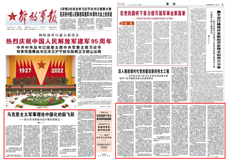 馬克思主義是我們黨的靈魂和旗幟,是人民軍隊(duì)一路向前的燈塔。95年來(lái),正是我們黨不斷推進(jìn)馬克思主義軍事理論中國(guó)化時(shí)代化,用以指導(dǎo)中國(guó)革命戰(zhàn)爭(zhēng)、重大軍事斗爭(zhēng)和人民軍隊(duì)建設(shè)實(shí)踐,我軍才能攻堅(jiān)克難、戰(zhàn)無(wú)不勝、不斷發(fā)展壯大。黨的十九屆六中全會(huì)決議鮮明提出,習(xí)近平新時(shí)代中國(guó)特色社會(huì)主義思想實(shí)現(xiàn)了馬克思主義中國(guó)化新的飛躍。習(xí)近平強(qiáng)軍思想作為習(xí)近平新時(shí)代中國(guó)特色社會(huì)主義思想的重要組成部分,是我們黨不懈探索中國(guó)特色強(qiáng)軍之路形成的寶貴思想結(jié)晶,是加快國(guó)防和軍隊(duì)現(xiàn)代化、全面建設(shè)世界一流軍隊(duì)的行動(dòng)綱領(lǐng),譜寫(xiě)了當(dāng)代中國(guó)馬克思主義軍事理論和軍事實(shí)踐發(fā)展的新篇章。