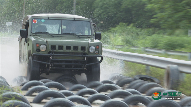 比武集訓(xùn)中,指揮車通過輪胎障礙路。