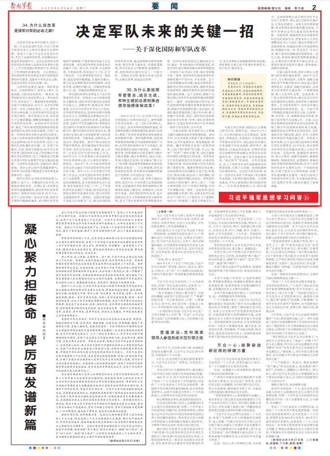 深化國防和軍隊改革是為了設計和塑造軍隊未來。我國進入由大向強發(fā)展的關鍵階段,國防和軍隊建設處在新的歷史起點上,放眼世界,縱觀全局,審時度勢,應對當今世界百年未有之大變局、有效維護國家安全,堅持和發(fā)展中國特色社會主義,協(xié)調(diào)推進全面建設社會主義現(xiàn)代化國家、全面深化改革、全面依法治國、全面從嚴治黨戰(zhàn)略布局,貫徹落實黨在新時代的強軍目標和新時代軍事戰(zhàn)略方針、履行好新時代軍隊使命任務,要求我們必須以更大的智慧和勇氣深化國防和軍隊改革。百舸爭流,奮楫者先;中流擊水,勇進者勝。面對千帆競發(fā)的世界新軍事革命,面對強國強軍事業(yè)的時代呼喚,我們必須有趕上潮流、趕上時代,力爭走在時代前列的雄心壯志。2014年2月,中央軍委成立深化國防和軍隊改革領導小組,習主席擔任領導小組組長。2015年7月,中央政治局常委會會議審議通過了深化國防和軍隊改革總體方案。同年11月,中央軍委召開改革工作會議,對深化國防和軍隊改革作出了全面部署。這輪軍隊改革是著眼長遠的戰(zhàn)略籌劃,是為黨和國家長治久安謀,基本考慮是為今后二十年、三十年國防和軍隊發(fā)展打下基礎,根本指向是實現(xiàn)黨在新時代的強軍目標、把人民軍隊全面建成世界一流軍隊。這輪改革是新中國成立以來最為廣泛、最為深刻的國防和軍隊改革,通過重塑重構(gòu)領導指揮體制、現(xiàn)代軍事力量體系、軍事政策制度,我軍生機活力不斷釋放、面貌煥然一新,國防和軍隊現(xiàn)代化邁上一個新臺階。實踐充分證明,強軍興軍動力在改革,出路在改革,前途也在改革。
