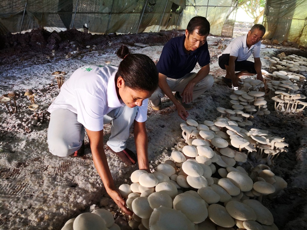 在斐濟(jì)楠迪,中國專家和當(dāng)?shù)毓蛦T檢查菌菇生長情況(2018年6月12日攝)。新華社記者 張永興 攝