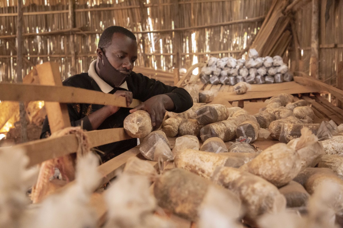 在盧旺達(dá)首都基加利的一家食用菌培育作坊,作坊主人埃馬紐埃爾·阿希馬納檢查菌袋(2020年9月9日攝)。中國福建農(nóng)林大學(xué)的菌草專家2006年來到盧旺達(dá)開始菌草技術(shù)合作項目,在當(dāng)?shù)厥痉逗屯茝V菌草技術(shù)。新華社發(fā)(西里爾·恩德格亞攝)