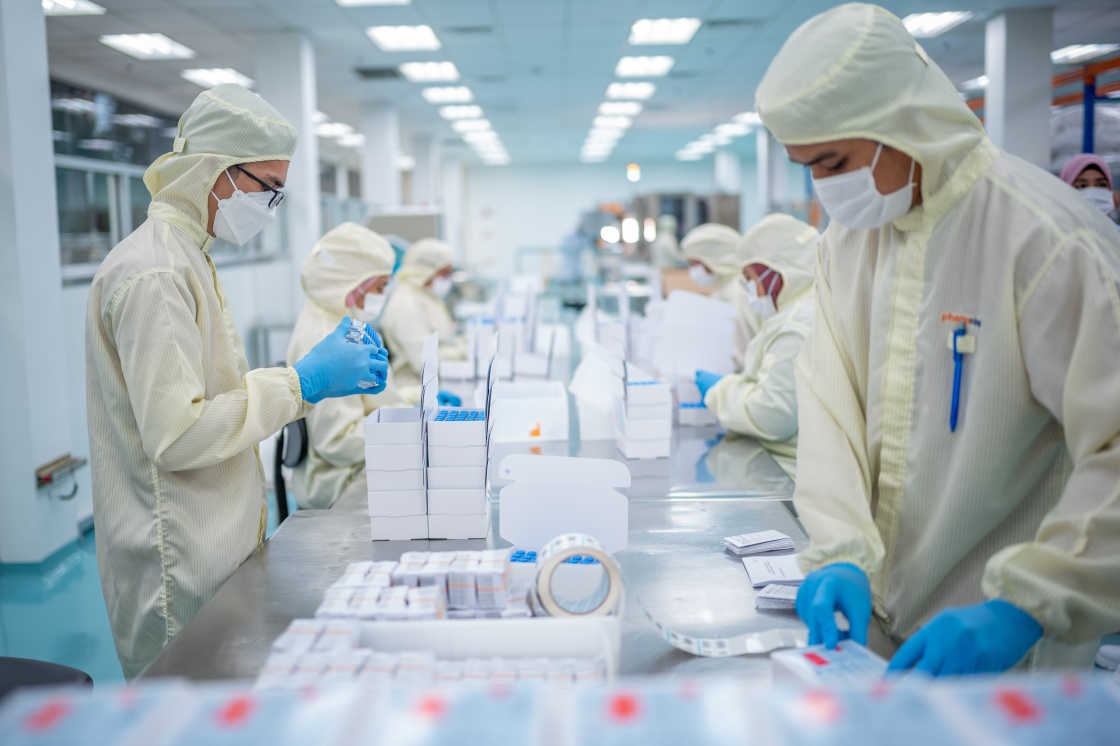 工人在馬來西亞吉隆坡郊區(qū)的發(fā)馬公司灌裝工廠包裝本地灌裝生產(chǎn)的科興疫苗(2021年10月5日攝)。新華社記者 朱煒 攝