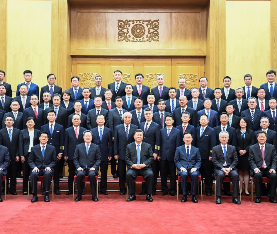 9月30日,黨和國家領(lǐng)導(dǎo)人習(xí)近平、韓正等在北京人民大會堂會見C919大型客機(jī)項目團(tuán)隊代表并參觀項目成果展覽。這是習(xí)近平等會見C919大型客機(jī)項目團(tuán)隊代表。新華社記者 丁林 攝