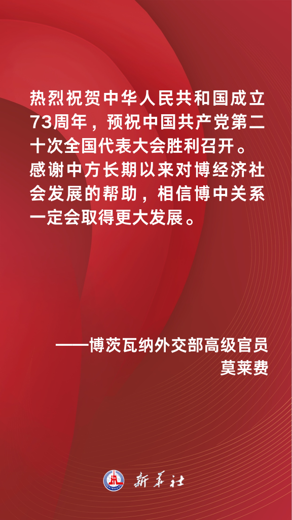 新華社北京10月2日電 我駐外使領(lǐng)館、使團(tuán)近日舉辦線下或云端國慶招待會等活動(dòng),慶祝中華人民共和國成立73周年,多個(gè)國際組織負(fù)責(zé)人、國家政要及各界人士出席活動(dòng)或以其他方式發(fā)表致辭,對中華人民共和國成立73周年表示熱烈祝賀,預(yù)祝中國共產(chǎn)黨第二十次全國代表大會勝利召開,并期待與中國進(jìn)一步深化各領(lǐng)域友好合作。