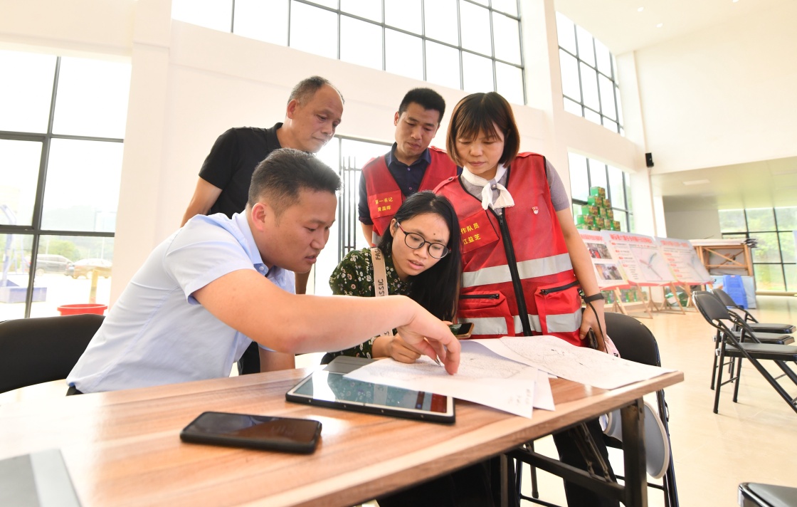 2022年5月6日,廣西柳州市融安縣大坡鄉(xiāng)崗偉村駐村第一書記黃晨暉(后排右)和鄉(xiāng)鎮(zhèn)干部、工程設(shè)計(jì)人員在大坡飛雞農(nóng)特產(chǎn)品大數(shù)據(jù)中心討論崗偉村產(chǎn)業(yè)示范帶方案。新華社記者 黃孝邦 攝