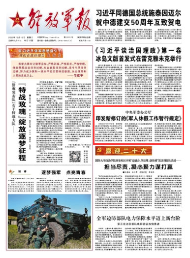 解放軍報北京10月11日電 程祥祿報道:經(jīng)中央軍委批準(zhǔn),中央軍委辦公廳日前印發(fā)新修訂的《軍人休假工作暫行規(guī)定》,自2023年1月1日起施行。
