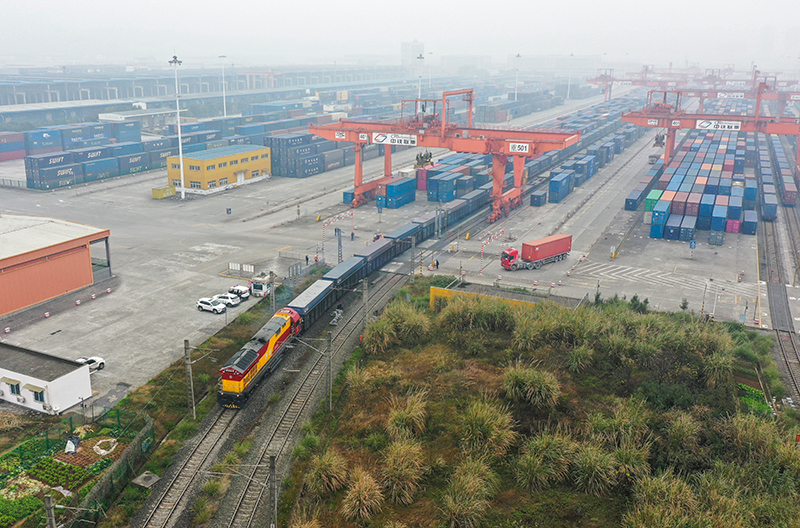 △2023年1月22日,農(nóng)歷新年首趟西部陸海新通道鐵海聯(lián)運班列從重慶團結村中心站發(fā)車(無人機照片)。