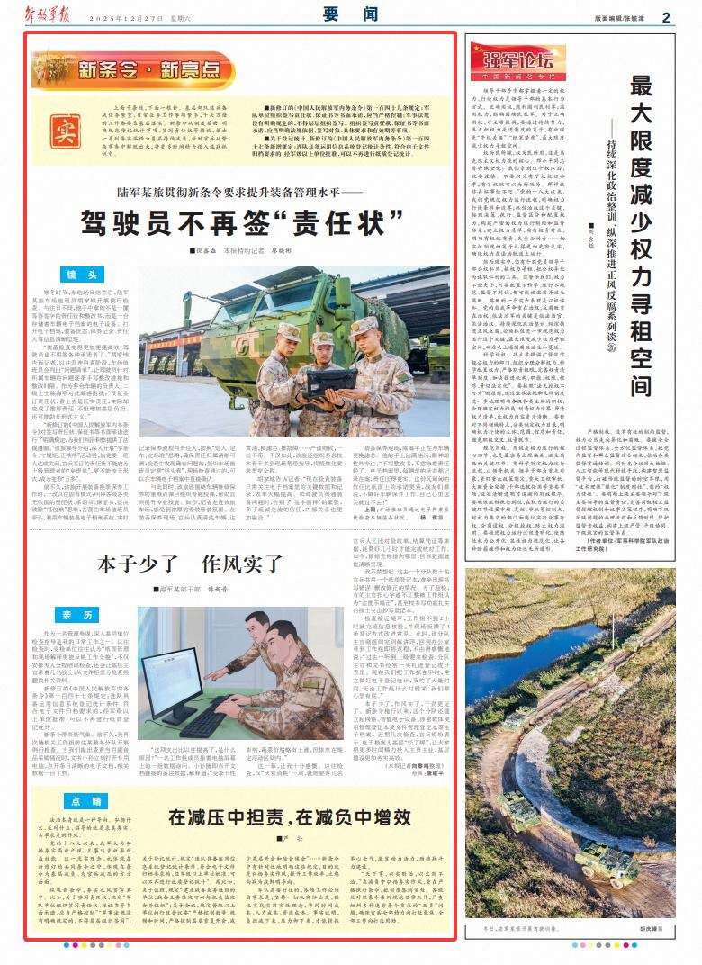 “裝備檢查變得更加便捷高效,駕駛員也不用簽各種承諾書了。”胡家城告訴記者,以往營連自查階段,車場值班員會列出“問題清單”,讓駕駛員針對所屬車輛的問題逐條手寫整改措施和整改時限。作為多臺車輛的負責人,二級上士陳海平對此頗感困擾:“反復簽訂責任狀,看上去是壓實責任,實際卻變成了推卸責任,不但增加基層負擔,還可能助長形式主義。”