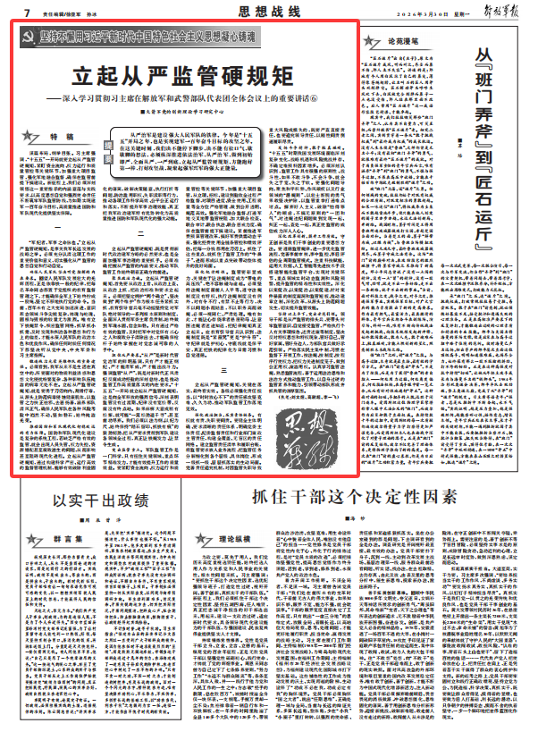 從嚴(yán)治軍是建設(shè)強(qiáng)大人民軍隊(duì)的鐵律。今年是“十五五”開(kāi)局之年,也是實(shí)現(xiàn)建軍一百年奮斗目標(biāo)的攻堅(jiān)之年。在這關(guān)鍵時(shí)刻,我們決不能停下腳步,決不能有松口氣、歇歇腳的想法,必須縱深推進(jìn)依法治軍、從嚴(yán)治軍,做到初始即嚴(yán)、全面從嚴(yán)、一嚴(yán)到底,立起從嚴(yán)監(jiān)管硬規(guī)矩,方能跑好第一棒、打好攻堅(jiān)戰(zhàn),凝聚起強(qiáng)軍興軍的強(qiáng)大正能量。