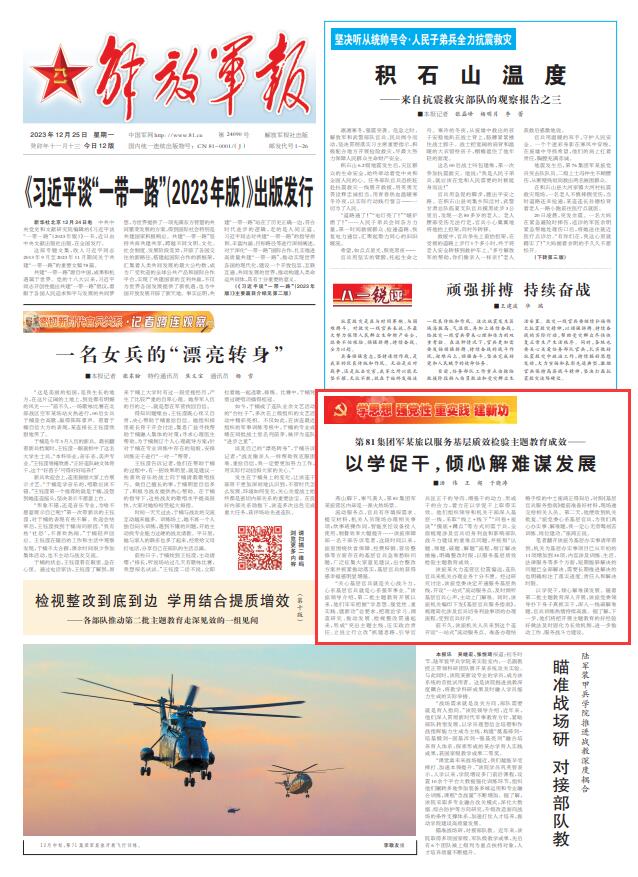“關(guān)心基層官兵就是關(guān)心戰(zhàn)斗力,心系基層官兵就是心系強軍事業(yè)?!痹撀妙I(lǐng)導介紹,第二批主題教育開展以來,他們牢牢把握“學思想、強黨性、重實踐、建新功”總要求,把理論學習、調(diào)查研究、推動發(fā)展、檢視整改貫通起來,形成“突出主題主線、壓實政治責任、立說立行立改”抓建思路,引導官兵匡正干的導向、增強干的動力、形成干的合力,著力在以學促干上取得實效。他們組織領(lǐng)導和機關(guān)干部深入基層一線,采取“線上+線下”“問卷+座談”“摸底+蹲點”等方式問需于兵,全面梳理涉及官兵切身利益和影響部隊戰(zhàn)斗力建設(shè)的重難點問題,并按照“認題、領(lǐng)題、破題、解題”流程,制訂解決措施,明確整改時限,以服務(wù)基層質(zhì)效檢驗主題教育成效。