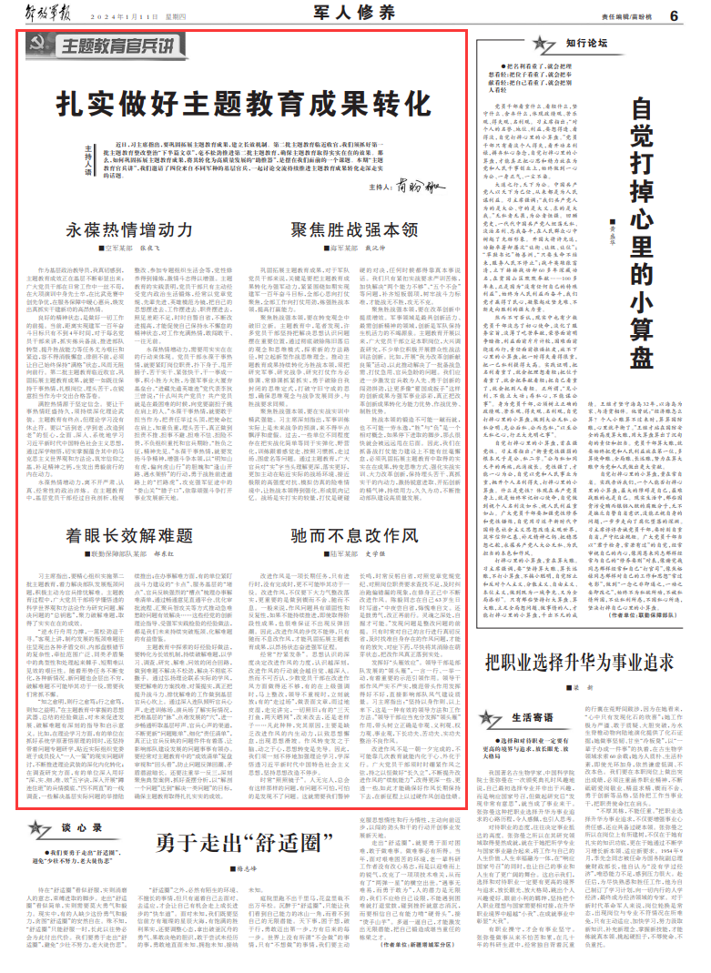 近日,習(xí)主席指出,要鞏固拓展主題教育成果,建立長效機(jī)制。第二批主題教育臨近收官,我們須抓好第一批主題教育整改整治“下半篇文章”,毫不松勁推進(jìn)第二批主題教育,確保主題教育取得實(shí)實(shí)在在的效果。那么,如何鞏固拓展主題教育成果,將其轉(zhuǎn)化為高質(zhì)量發(fā)展的“助推器”,是擺在我們面前的一個(gè)課題。本期“主題教育官兵講”,我們邀請(qǐng)了四位來自不同軍種的基層官兵,一起討論交流持續(xù)推進(jìn)主題教育成果轉(zhuǎn)化走深走實(shí)的話題。
