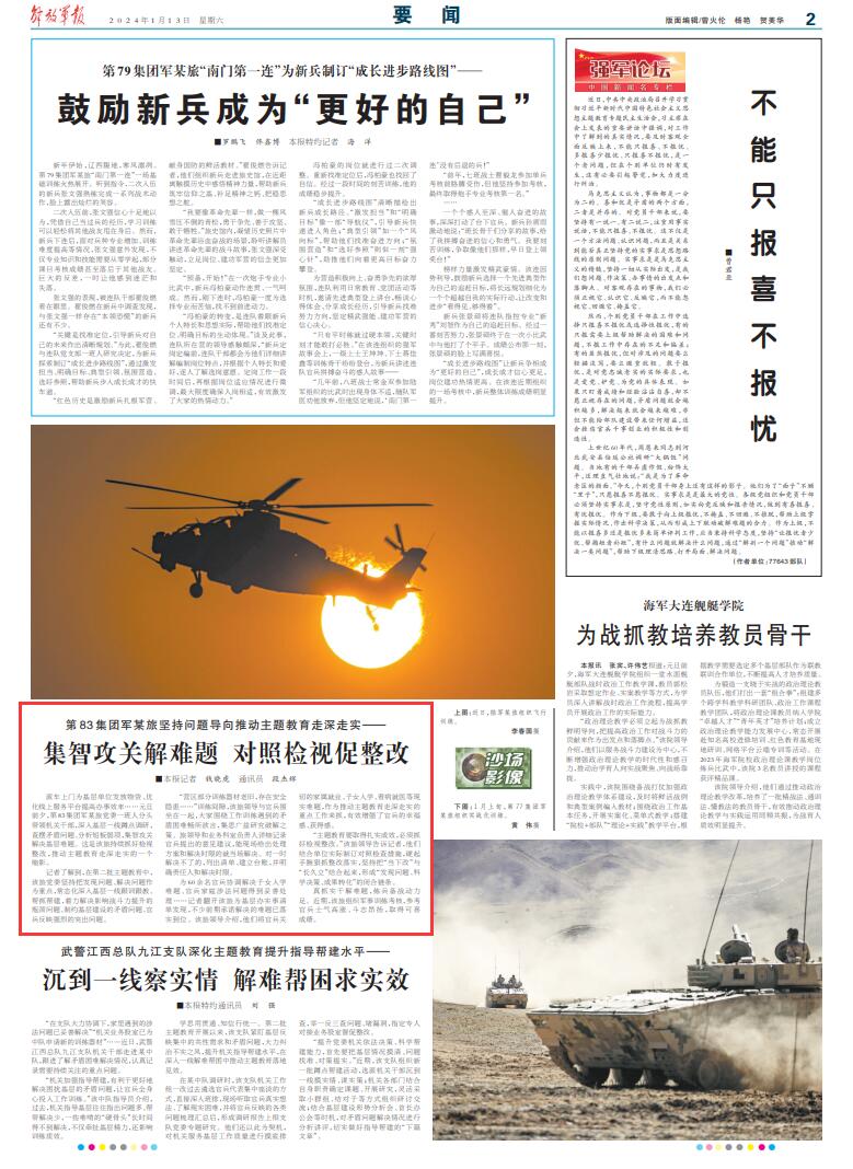 派車上門為基層單位發(fā)放物資、優(yōu)化線上服務(wù)平臺提高辦事效率……元旦前夕,第83集團(tuán)軍某旅黨委一班人分頭帶領(lǐng)機(jī)關(guān)干部,深入基層一線蹲點調(diào)研,查擺矛盾問題、分析短板弱項,集智攻關(guān)解決基層難題。這是該旅持續(xù)抓好檢視整改,推動主題教育走深走實的一個縮影。