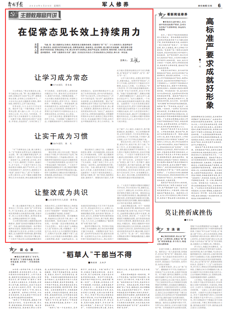 當(dāng)前,第二批主題教育正在收官,鞏固深化主題教育成果,關(guān)鍵要在“?!薄伴L”二字上持續(xù)用力,促進(jìn)理論學(xué)習(xí)、整改落實、改進(jìn)作風(fēng)等形成常態(tài)化,著眼發(fā)展所需、備戰(zhàn)所急、基層所盼,建立健全長效機制。我們要將主題教育中的好經(jīng)驗、好做法固定下來,樹立終身學(xué)習(xí)的理念,保持嚴(yán)的態(tài)度、實的作風(fēng)、硬的舉措、行的自覺,持續(xù)推進(jìn)問題整改。本期“主題教育官兵講”,邀請三位基層官兵結(jié)合工作實際談?wù)勛约旱目捶?,和大家一同交流?/p>