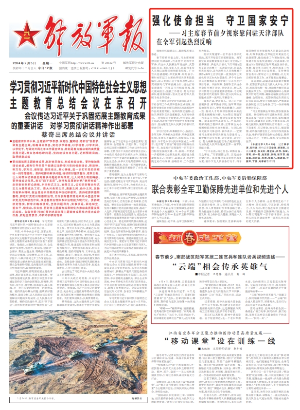 (解放軍報(bào)北京2月4日電 記者康子湛、張科進(jìn),特約記者汪學(xué)潮、胡瑞智,通訊員康克、張光軒、傅金泉、呂偉、張斌、李芮、鄒一萌、趙富豪、張鶴、張玉菲、魏昶昊、趙治國(guó)、倪帥、楊超凡、陶建霖、許韶玉、丁雷、劉家岐等采寫)