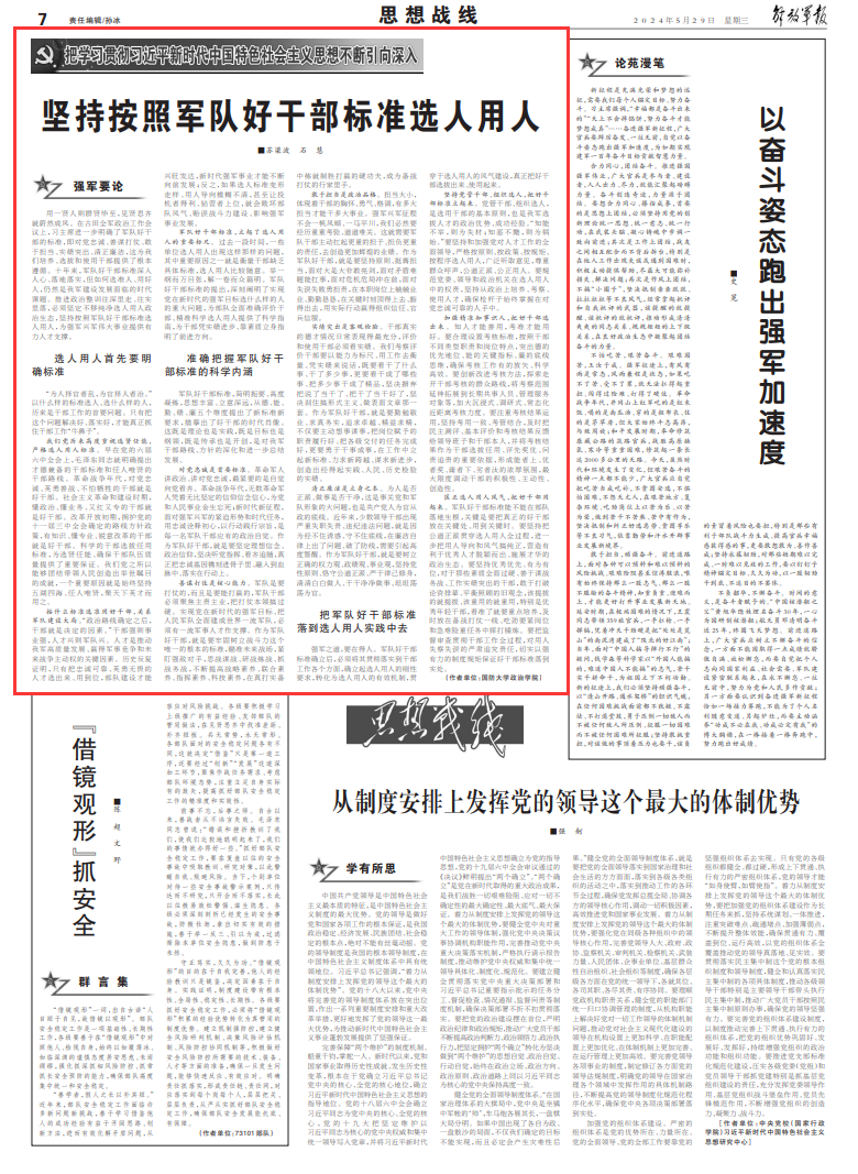 用一賢人則群賢畢至,見(jiàn)賢思齊就蔚然成風(fēng)。在古田全軍政治工作會(huì)議上,習(xí)主席進(jìn)一步明確了軍隊(duì)好干部的標(biāo)準(zhǔn),即對(duì)黨忠誠(chéng)、善謀打仗、敢于擔(dān)當(dāng)、實(shí)績(jī)突出、清正廉潔,這為我們培養(yǎng)、選拔和使用干部提供了根本遵循。十年來(lái),軍隊(duì)好干部標(biāo)準(zhǔn)深入人心、落地落實(shí),但如何選準(zhǔn)人、用好人,仍然是我軍建設(shè)發(fā)展面臨的時(shí)代課題。推進(jìn)政治整訓(xùn)往深里走、往實(shí)里落,必須堅(jiān)定不移純凈選人用人政治生態(tài),堅(jiān)持按照軍隊(duì)好干部標(biāo)準(zhǔn)選人用人,為強(qiáng)軍興軍偉大事業(yè)提供有力人才支撐。