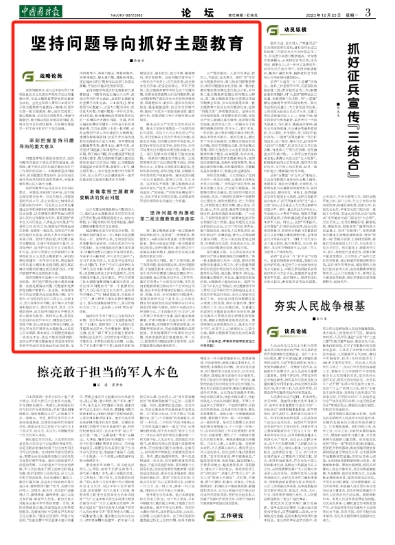 堅(jiān)持問題導(dǎo)向是抓好主題教育的重要保證。問題導(dǎo)向是正確認(rèn)識(shí)世界、改造世界的科學(xué)方法論,是抓好主題教育的重要手段和方法。習(xí)主席指出,要有強(qiáng)烈的問題意識(shí),以重大問題為導(dǎo)向,抓住重大問題、關(guān)鍵問題進(jìn)一步研究思考,找出答案,著力推動(dòng)解決我國發(fā)展面臨的一系列突出矛盾和問題。當(dāng)前,我軍正錨定如期實(shí)現(xiàn)建軍一百年奮斗目標(biāo)勇毅奮進(jìn),但前進(jìn)道路上不是一帆風(fēng)順,必然會(huì)遇到許多從未出現(xiàn)過的全新課題、遭遇各種艱難險(xiǎn)阻、經(jīng)受許多風(fēng)高浪急甚至驚濤駭浪的重大考驗(yàn)。我軍要積極進(jìn)取贏得優(yōu)勢、贏得主動(dòng)、贏得未來,必須堅(jiān)持問題意識(shí)和問題導(dǎo)向,敢于正視問題,勇于解決問題,深刻把握強(qiáng)軍勝戰(zhàn)的時(shí)代要求,聚力破解制約部隊(duì)建設(shè)發(fā)展和備戰(zhàn)打仗的突出問題,以問題整改來強(qiáng)基固本鑄牢軍魂、凝聚軍心士氣、建功強(qiáng)軍事業(yè),為實(shí)現(xiàn)黨在新時(shí)代的強(qiáng)軍目標(biāo)、把人民軍隊(duì)全面建成世界一流軍隊(duì)奠定堅(jiān)實(shí)基礎(chǔ)和提供有力支撐。