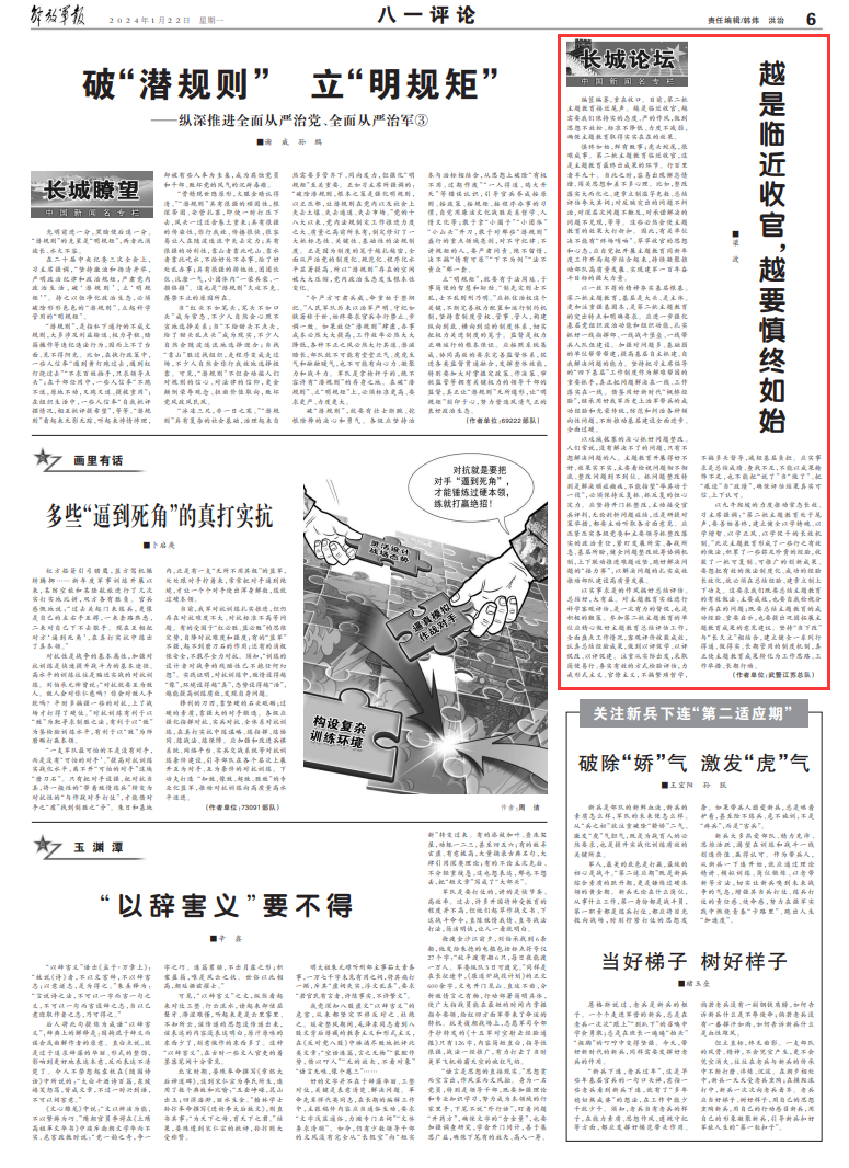 慎終如始,鮮有敗事;虎頭蛇尾,很難成事。第二批主題教育臨近收官,這是主題教育最終出成果的環(huán)節(jié)。行百里者半九十。當(dāng)此之時(shí),容易出現(xiàn)懈怠情緒、闖關(guān)思想和差不多心理。比如,整改落實(shí)大而化之、建章立制濫竽充數(shù)、總結(jié)評(píng)估夸大其詞;對(duì)反映突出的問(wèn)題不糾治,對(duì)深層次問(wèn)題不觸及,對(duì)承諾解決的問(wèn)題不兌現(xiàn),等等。這些必然會(huì)使主題教育的效果大打折扣。因此,有關(guān)單位決不能有“終場(chǎng)哨響”、草草收官的思想和心態(tài),應(yīng)自覺(jué)把開(kāi)展主題教育同新年度工作開(kāi)局起步結(jié)合起來(lái),持續(xù)凝聚推動(dòng)部隊(duì)高質(zhì)量發(fā)展、實(shí)現(xiàn)建軍一百年奮斗目標(biāo)的強(qiáng)大力量。