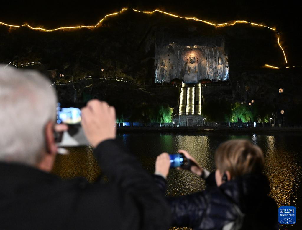 11月4日,外賓在河南省洛陽市龍門石窟景區(qū)禮佛臺拍照留念。新華社記者 李嘉南 攝