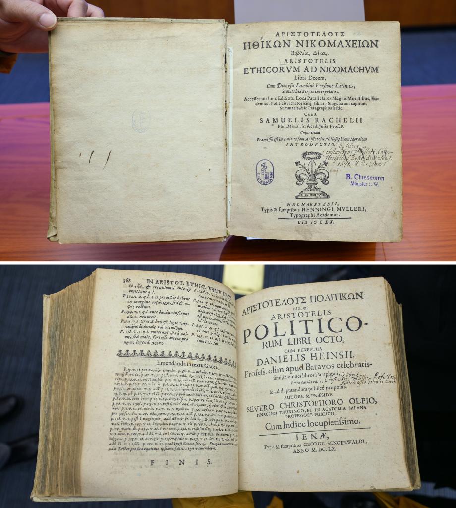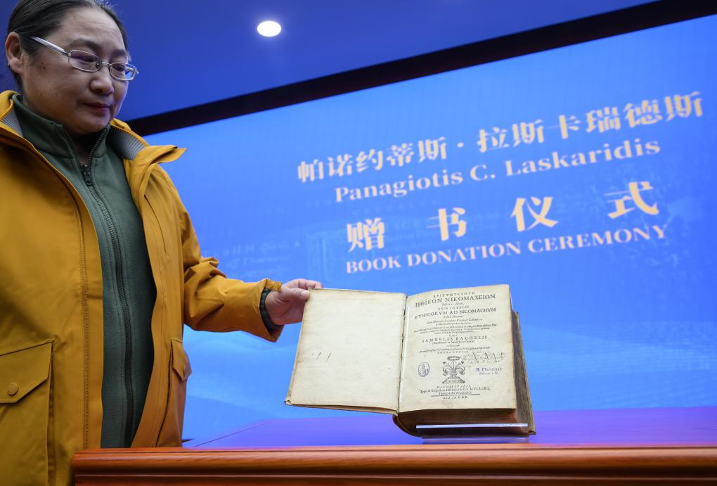 11月7日,在首屆世界古典學(xué)大會(huì)期間,希臘??ㄌ乩锬帷だ箍ㄈ鸬滤够饡?huì)向中國(guó)社會(huì)科學(xué)院贈(zèng)送兩部古典學(xué)研究古籍,分別為17世紀(jì)印刷的亞里士多德著作《尼各馬可倫理學(xué)》和《政治學(xué)》。