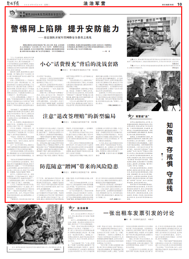 今年以來,旅隊(duì)積極開展“全民反詐在行動(dòng)”活動(dòng),邀請(qǐng)駐地公安部門技術(shù)人員走進(jìn)軍營(yíng),講述高發(fā)網(wǎng)絡(luò)詐騙類型和最新詐騙方法套路,引導(dǎo)官兵科學(xué)用網(wǎng)、安全用網(wǎng),強(qiáng)化識(shí)騙防騙意識(shí)。在“法律服務(wù)進(jìn)基層”活動(dòng)中,法律專家通過普法宣講介紹正確維權(quán)手段,解決官兵不知法、不懂法等難題,幫助官兵提高維護(hù)自身合法權(quán)益的能力。官兵根據(jù)所學(xué)內(nèi)容自制創(chuàng)意短視頻,以寓教于樂的形式營(yíng)造全員參與的濃厚氛圍。