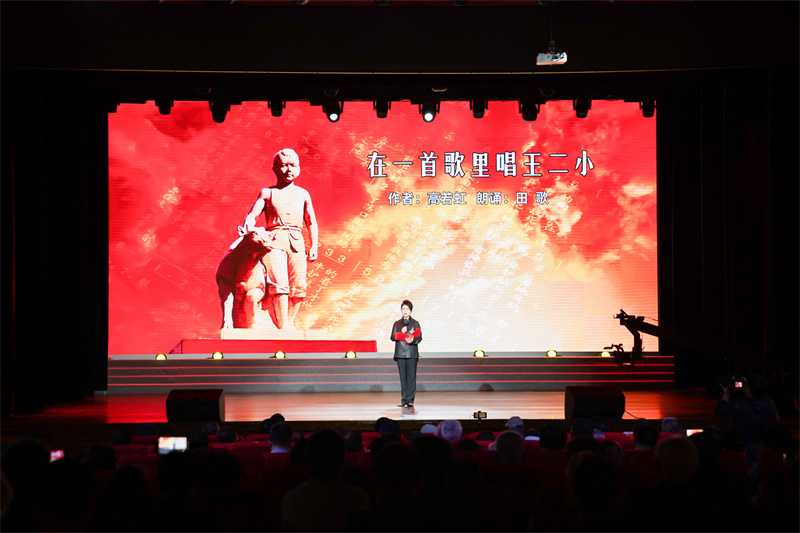 朗誦作品具有多元視角與情感濃度。詩歌切入角度豐富多元。侯明輝的《這把大刀》以器物承載歷史與精神,馬克的《一封最后的家書》聚焦個體在生死關(guān)頭的柔情與決絕,雷從俊的《我們的抗戰(zhàn)》從十四年宏觀的角度回顧了這場戰(zhàn)爭的奇?zhèn)?。東來的《二月里最后的棉絮》則以細微意象折射戰(zhàn)爭的殘酷與人性的溫暖。崔吉俊的《回太行》、高昌的《致敬公木》、陳燦的《她們要燃燒自己給中國取暖》、郭曉曄的《濁漳河》、宗德宏的《這一天,我們的旗幟飛揚》、劉笑偉的《延安,延安》等,或緬懷先賢,或詠嘆山河,或抒發(fā)豪情,共同編織了一幅情感濃烈、層次豐富的軍旅畫卷。張國領(lǐng)的《血太陽》以其強烈的意象和沖擊力,奠定了基調(diào)的悲壯與崇高。高昌的《致敬公木——爺爺和孫女的對話》,則從獨特的視角,致敬《中國人民解放軍軍歌》的詞作者公木先生。而作者高昌的愛人就是公木的親孫女,因此作品的情感色彩非常濃厚,直抒胸臆。兩代人隔空對話,謳歌的是同一個主題:我們的隊伍向太陽!